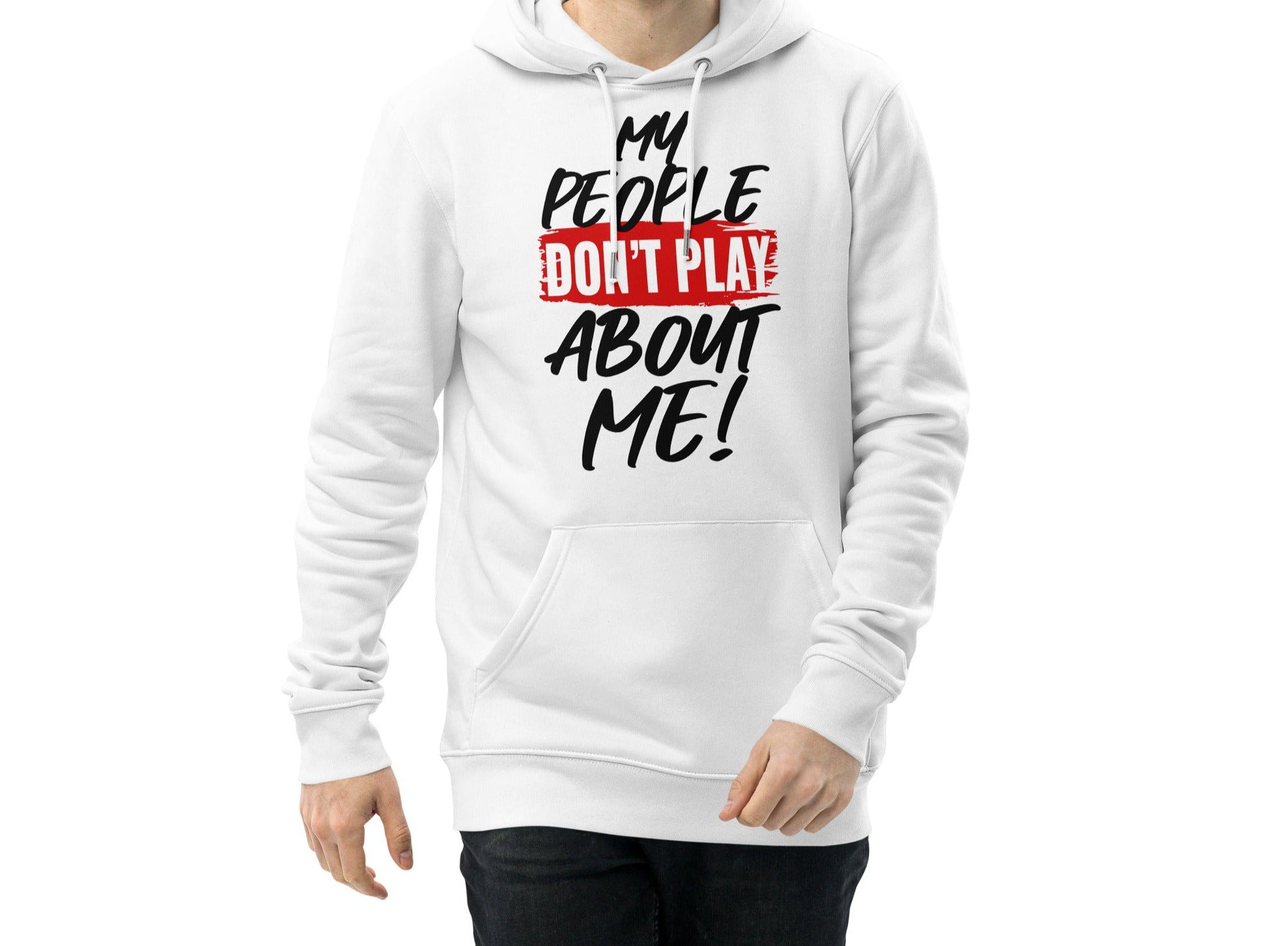 This unisex essential eco hoodie features a bold "my people don't play about me" slogan, perfect for making a statement . This hoodie provides both comfort and style. Show your pride and make a positive impact with this must-have hoodie.